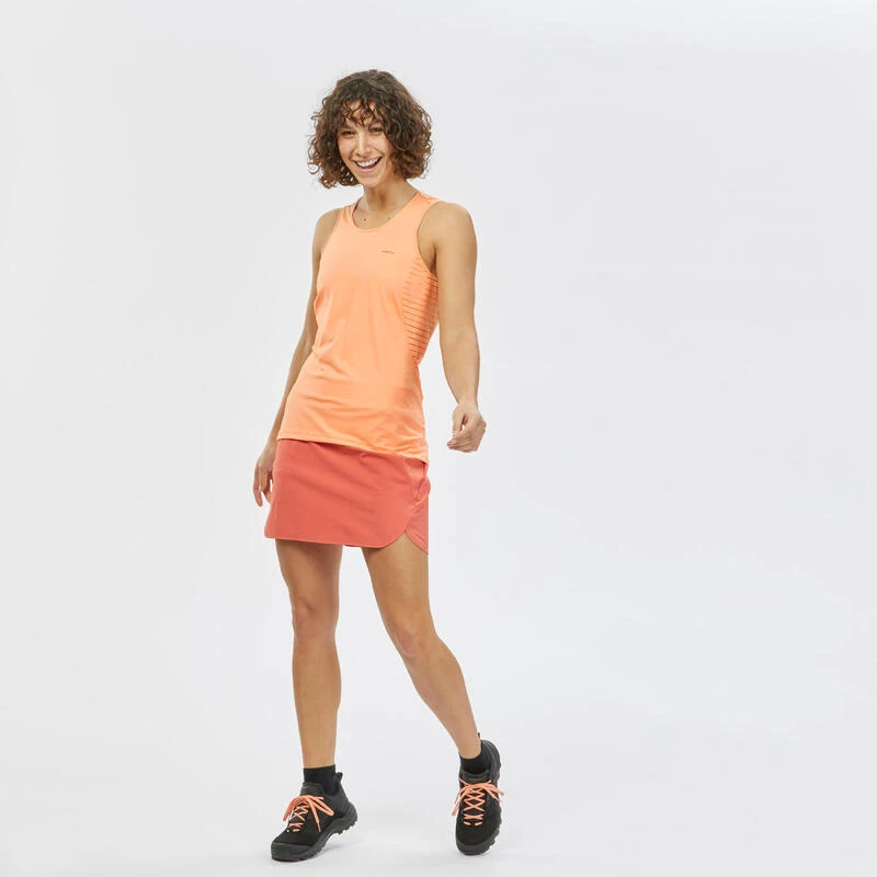 Dit topje heeft een sportief, iets aansluitend model om vocht gemakkelijker naar buiten af te voeren. Langer en goed bedekkend rugpand zodat je rugzak nooit over je blote huid schuurt.