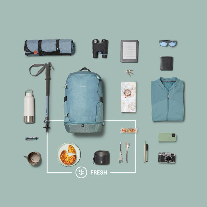 Onderaan komen de zware spullen. Stop je kleding daar omheen. Stop je regenjasje en/of een fleece ergens waar je gemakkelijk bij kunt. In de zakjes steek je klein materiaal voor tijdens de dag (zonnecrème, kaarten, zonnebril, …). Je waterzak stop je in het vak langs de rug, je veldfles past in een van de daartoe voorziene zakken binnenin.
